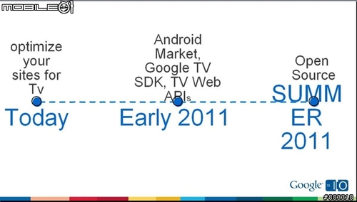Google TV的發(fā)展時(shí)程為今年5月在Google I/O大會對外發(fā)表最消息;2011年初預(yù)期推出針對Google TV的Android Market、Google TV SDK,以及將網(wǎng)絡(luò)內(nèi)容延伸至與TV內(nèi)容結(jié)合;2011年夏季將會在Android和Chrome的code branches中釋出Google TV平臺的原始碼。