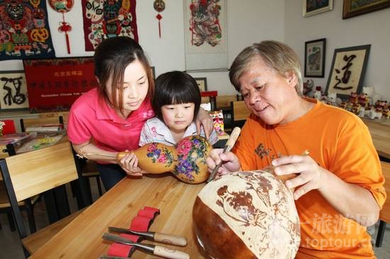 游客在中國(guó)民間藝術(shù)體驗(yàn)館感受傳統(tǒng)藝術(shù)的魅力。