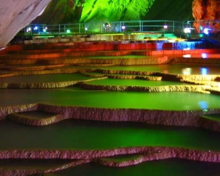 ??? 順著巖洞長長的石階往下走,遠(yuǎn)遠(yuǎn)地便能望見洞內(nèi)各色迷離的燈光,巨大的光柱打在巖壁上,晃動(dòng)變化,照出各式各樣的嶙峋怪石,帶來一種隱秘的刺激和興奮感。雖然還是下午,可是洞里卻如同午夜,伸手不見五指;這樣卻反倒凸顯出舞臺(tái)效果之好,所有光亮都集中于一處,成為視線的焦點(diǎn),溶洞真是天然的大舞臺(tái)。