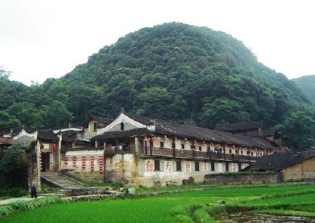 ??? 步入村內(nèi),立即就被青石墻壁迷住,一塊塊淡青色的磚石排列出整齊的圖案,大概是山石鑿出的緣故,石質(zhì)堅(jiān)硬細(xì)膩,手感有微涼。偶爾有小棵的雜草頑強(qiáng)地插足于石縫之間,幽綠的葉子倒垂下來,頗具韻味。屋子的檐角都是高蹺而起,由整齊的黑瓦壘成,映襯著藍(lán)天,明明是尖銳的,卻讓人覺得舒服平和。愛極了這樣的南方建筑,好像每一處張揚(yáng)都是低調(diào)的,溶解在青石黑瓦的寡淡里,無言地講述著一方的處世哲學(xué)。