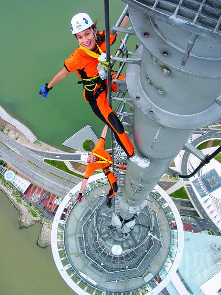 高達(dá)338米的澳門觀光塔可以游覽得很刺激,甚至可以說(shuō)是澳門最刺激的項(xiàng)目之一?!耙卉S而下”和“百步登天”雖然是完全相反的體驗(yàn)方式,但都是對(duì)人自身極大的挑戰(zhàn)。當(dāng)然,你完全可以只做個(gè)看客,在俯瞰澳門美景的同時(shí),向那些勇敢者致敬。