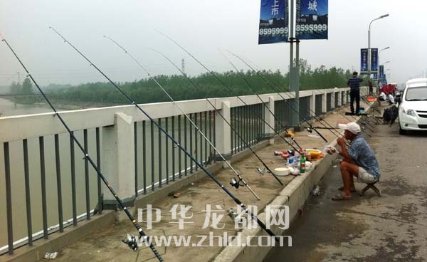 周口市區(qū)沙潁河周口大道橋上,兩側(cè)的護欄上整齊地擺放著幾十根漁竿,數(shù)名垂釣愛好者忙得不亦樂乎。