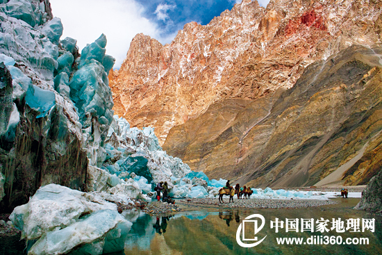 在克勒青河谷的冰瀑區(qū),崩塌的冰塊像一塊塊青色透明的水晶散落在喀喇昆侖山中。5月份進入克勒青河谷,冬季的冰雪正在慢慢融化,匯集的河水清澈見底,沒有一絲污染,純凈的天地,令人神往。