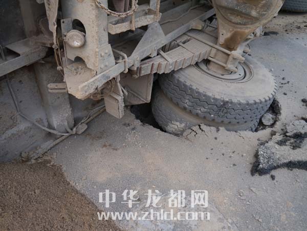 記者看到,貨車后輪處的路面被壓了個大坑,車輪陷在里面(小圖)。