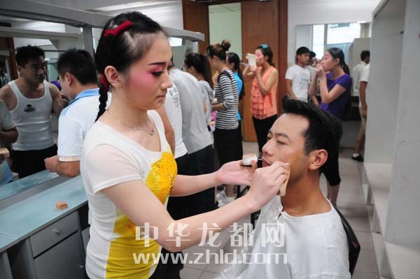 ??? 昨天晚上,豫劇《山城母親》在北京長(zhǎng)安大戲院上演。圖為演出前,工作人員在后臺(tái)為演員精心化妝。(記者 李寒 攝)