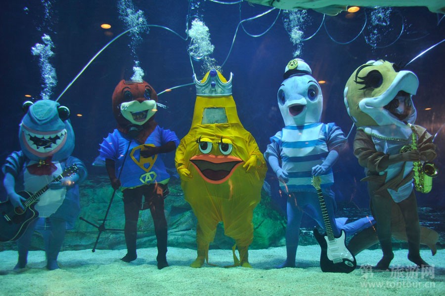 ????北京海洋館的五個(gè)吉祥物組成的團(tuán)體堪稱全國首個(gè)水下偶像樂團(tuán)。此次新春首秀,精心編排的樂器演奏及獨(dú)具特色的水下炫舞都將為游客帶來了全新的視聽享受。藍(lán)色水池為舞臺(tái),國寶中華鱘為舞伴。主唱海獅激情高歌,吉他手海豚、鯊魚與薩克斯中華鱘伴奏,海星隨著音樂節(jié)拍舞動(dòng)著身體……以往人們看到的卡通人偶是在陸地上表演的,不受壓力與浮力的限制,活動(dòng)靈活自如。但是在水下想要完美演繹既定動(dòng)作需要潛水員具備高超的技能、過硬的心理素質(zhì)、充沛的體能和幕后辛苦的排練。