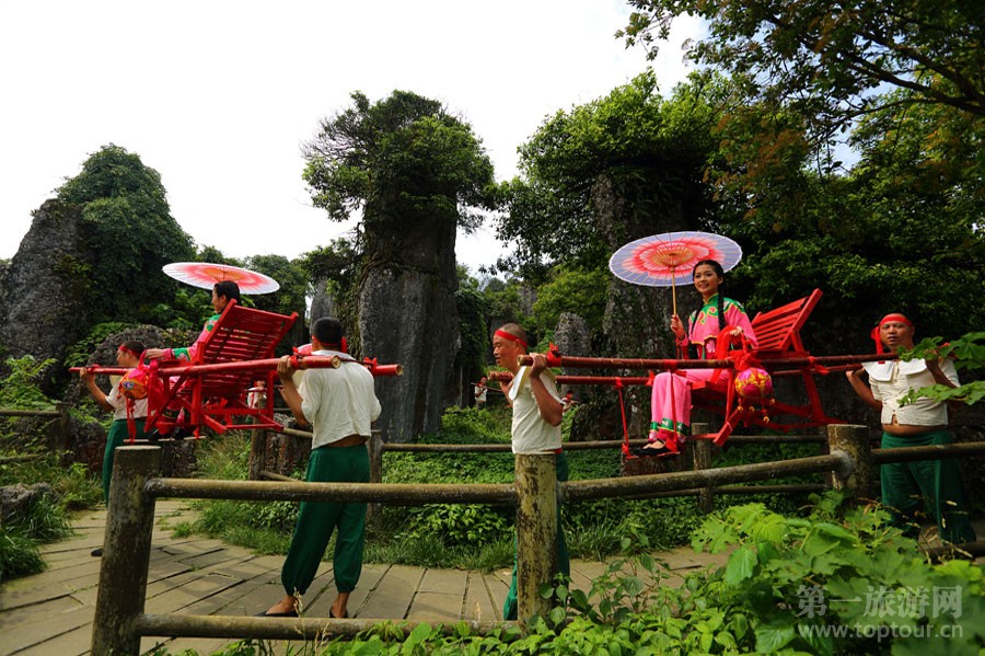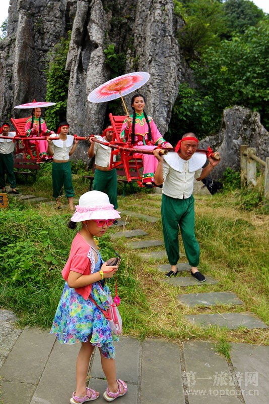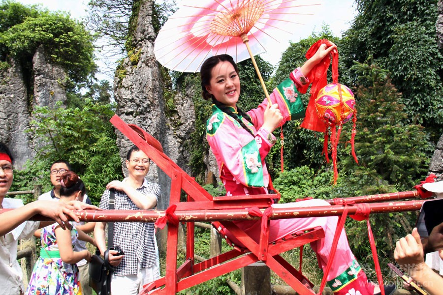 ????如織的游客在觀賞“滑竿抬幺妹”