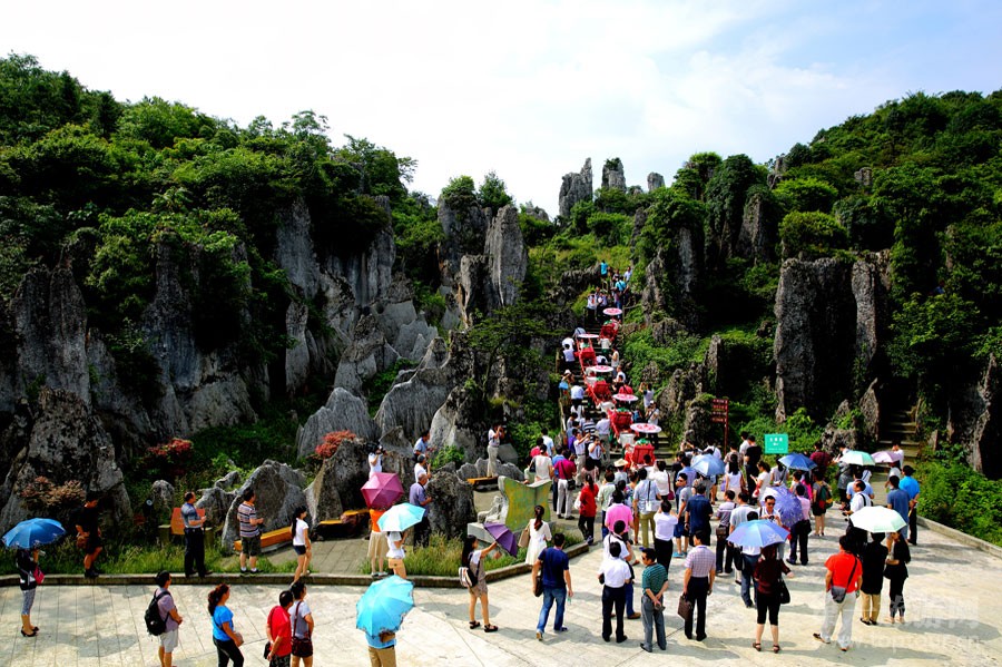 ????幺妹在石林中為游客展演自己的純樸與靚麗。