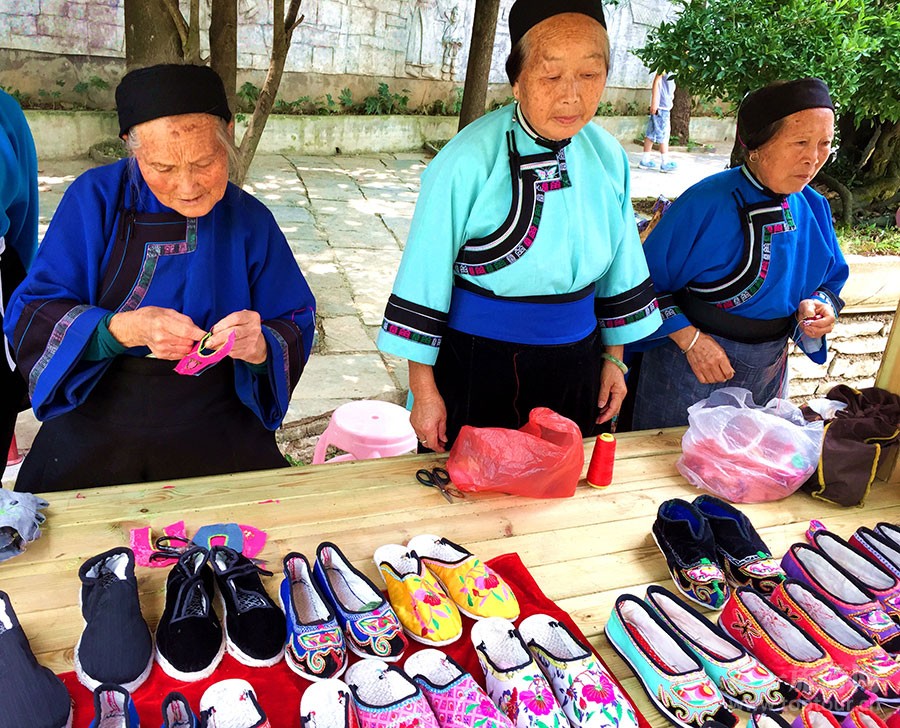 ????安順是屯堡文化之鄉(xiāng)。老孃嬢手中的翹翹鞋是大明遺風(fēng),相傳是為朱元璋的“大腳馬皇后”專門設(shè)計(jì)的。600年后的今天,它依然穿在屯堡婦女的腳上。