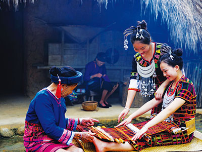 ????當?shù)貗D女在景區(qū)為游客展示織繡 檳榔谷景區(qū)供圖
