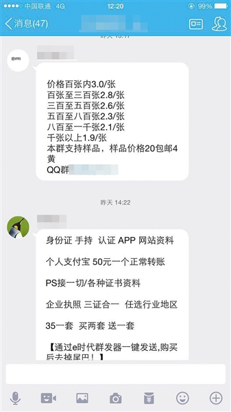 ????記者在前述QQ群里發(fā)現(xiàn),有賣家給出的“批發(fā)價格”是:100張內(nèi)3元一張;300張至500張為2.6元一張;500張至800張是2.3元一張;800張至1000張是2.1元一張;千張以上是1.9元一張。