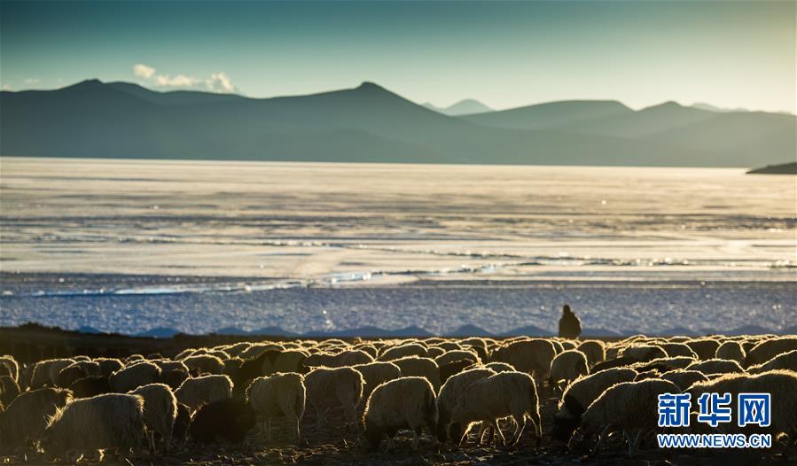 ????一名晚歸的牧羊人在冰封的普姆雍措湖邊。