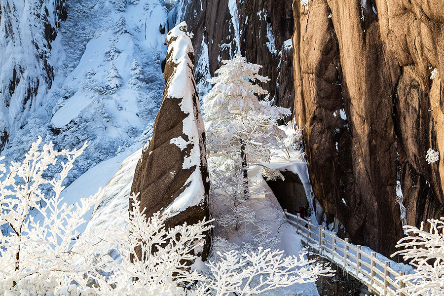 ????黃山以奇松、怪石、云海、溫泉、冬雪著稱于世。雪后黃山,山上、樹上、石階上睡滿了雪花,譽為“人間仙境”的黃山在雪的襯托下,處處銀裝素裹、端莊輕靈;玉樹瓊枝,滿目瓊樓玉宇。(方立華)