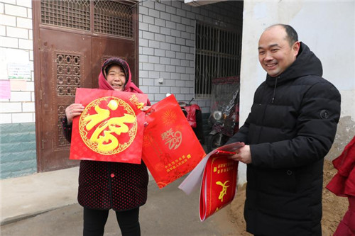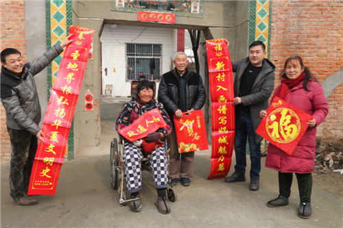 1月16日,西華縣艾崗鄉(xiāng)鐵爐村村民馬永清接過該縣縣委宣傳部駐村扶貧干部送來的春聯(lián)喜上眉梢。據(jù)了解,今年春節(jié)前夕,該縣財(cái)政投入200余萬元購置80萬副春聯(lián)在全縣鄉(xiāng)村范圍內(nèi)廣泛開展贈(zèng)春聯(lián)、送祝?;顒?dòng)。