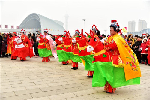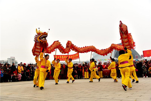 展演現(xiàn)場,人頭攢動,鑼鼓喧囂,16名身穿金黃、亮藍(lán)衣服的舞龍隊員率先登場,金燦燦的巨龍時而甩尾前行,時而昂首盤踞,浩浩蕩蕩;8只舞獅歡騰雀躍、活靈活現(xiàn);精美的裝飾的旱船穿行其中,老生、老旦扮相的隊員邊走邊唱;整齊劃一的腰鼓隊以及隊形優(yōu)美的擔(dān)經(jīng)挑把現(xiàn)場氣氛推向高潮……持續(xù)近2小時的展演活動中,精彩的民俗表演令人目不暇接,為這座城市增添了濃濃的年味。