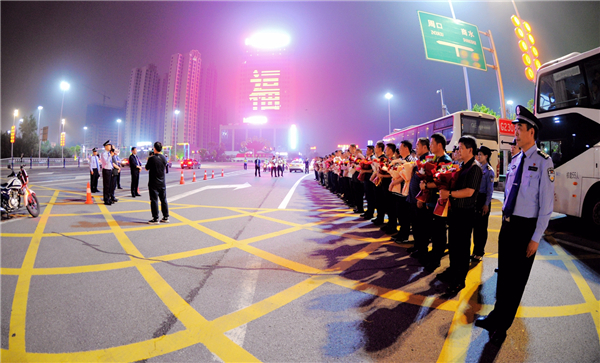 5月14日22時(shí),商水縣在寧洛高速周口南站口舉行隆重的歡迎儀式,迎接外出執(zhí)行抓捕任務(wù)凱旋的民警輔警??h委副書(shū)記張峰,縣人大常委會(huì)副主任楊新權(quán),縣政協(xié)副主席劉萬(wàn)華,縣政府黨組成員、公安局長(zhǎng)王之棟等出席儀式??h公安局黨委班子成員、局直警種負(fù)責(zé)人和民警代表參加了活動(dòng)。