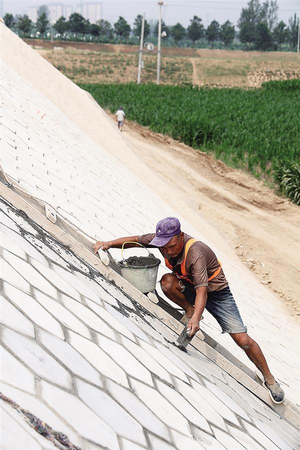7月16日上午,熱浪襲人,一名工人在橋堤上進(jìn)行施工作業(yè)。記者在中心城區(qū)建設(shè)大道東延段新運(yùn)河大橋施工現(xiàn)場(chǎng)看到,數(shù)十位工人不顧天氣炎熱,專(zhuān)注地進(jìn)行施工作業(yè)。工人們辛勤付出,古銅色的皮膚上早已汗珠密布。新建成的建設(shè)大道新運(yùn)河大橋見(jiàn)證了他們的奮斗瞬間。(記者 劉俊濤 攝)