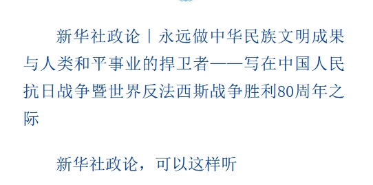 紀(jì)念大會(huì)前幾天,新華社播發(fā)政論《永遠(yuǎn)做中華民族文明成果與人類(lèi)和平事業(yè)的捍衛(wèi)者——寫(xiě)在中國(guó)人民抗日戰(zhàn)爭(zhēng)暨世界反法西斯戰(zhàn)爭(zhēng)勝利80周年之際》。廣大讀者的共鳴,正如我們寫(xiě)作時(shí)的感受:再次回望苦難輝煌交織的抗戰(zhàn)歲月,思想感情的潮水在心里激蕩奔流。