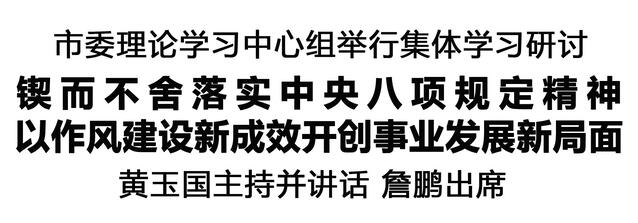 本報訊(記者 王艷) 1月16日,市委理論學(xué)習中心組舉行集體學(xué)習研討,深入學(xué)習貫徹習近平新時代中國特色社會主義思想,全面貫徹落實黨的二十屆四中全會精神,以打攻堅戰(zhàn)、持久戰(zhàn)的決心和恒心,鍥而不舍落實中央八項規(guī)定精神,推進作風建設(shè)常態(tài)化長效化,以優(yōu)良作風凝心聚力、真抓實干,為開好民主生活會打牢思想基礎(chǔ)。市委書記黃玉國主持并講話。市長詹鵬出席。