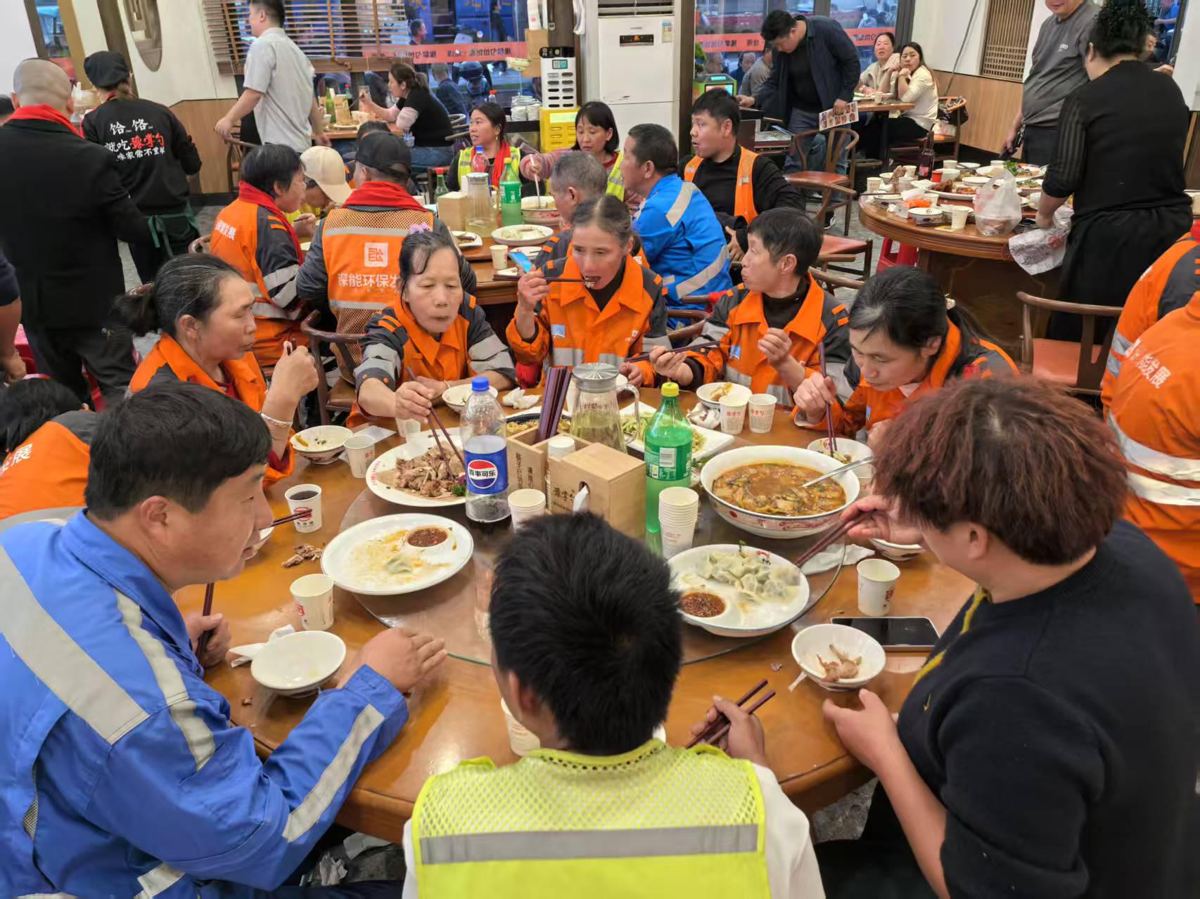 活動當天,剛剛結(jié)束清掃工作的“城市美容師”們身穿工服陸續(xù)抵達。張高鵬早已在門口迎接,熱情問候每一位工人并送上新春祝福。席間,道口燒雞、五香牛蹄筋、酸菜魚等十多道佳肴相繼上桌,暖意融融的用餐氛圍中,歡聲笑語不斷,如家人般親切溫馨。