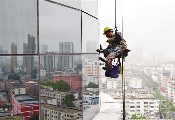 近日,一名“蜘蛛人”在中心城區(qū)一座大樓的外墻面認真作業(yè),為城市的美麗和整潔貢獻著自己的力量