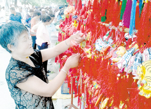 昨日,年過七旬的張老太太早早的在國槐路菜市場擺開了香包攤位,她自豪地告訴記者:“我做的香包可受歡迎了,鄭州、開封的記者還采訪過我呢。”(記者 沈湛 攝)